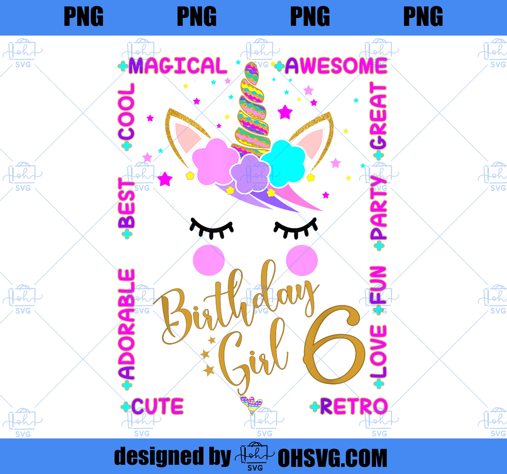 Unicorn 6th Birthday Girl Six years old Kids Gift PNG, Magic Unicorn PNG, Unicorn PNG